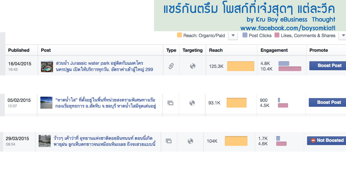 จากภาพด้านบน ผมเอาพระเอก นางเอก ที่เป็นHighlight แต่วีคของเพจไปเที่ยวกัน(www.facebook.com/gothaitogether ) มาแสดงให้ดู ดูที่คอลัมน์ Engagement ซิครับ จะมีโพสก์สุดเจ๋งที่เป็นพระเอกนางเอก มาผลัดเปลี่ยนหมุนเวียนกันไป คุณสามารถดูข้อมูลได้จาก แทป Insight>posts ในเพจของคุณครับ