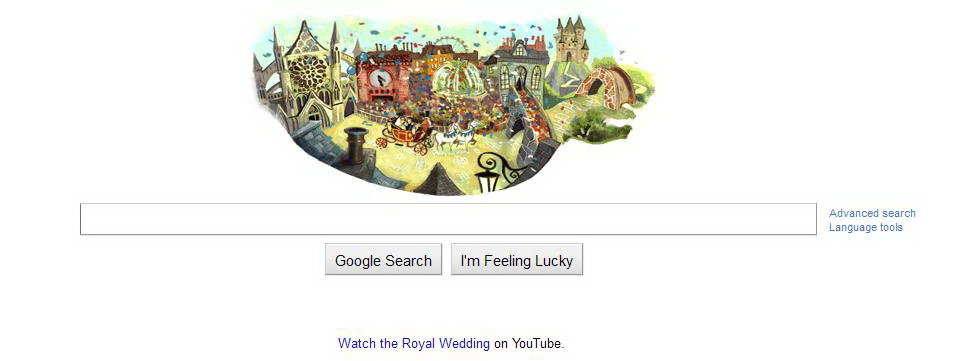 Doodle ในวัน Royal Wedding Day ของอังกฤษ Google ออกแบบโลโก้ของตัวเองเป็น บรรยากาศของรถม้าของคู่อภิเษกสมรสเคลื่อนไปตามถนนของกรุงลอนดอนไปยังโบสก์ Westminster Abbey ซึ่งเป็นภาพ illustration ที่สะท้อนสีสันของงานรื่นเริงได้น่าดูทีเดียว ส่วน Alt Text ของ Doodle จะเป็น The Wedding of  Prince William and Catherine Middleton (Alt Text คือ คำบรรยายเมื่อเราเอาเมาส์ไปวางที่รูปหรือลิ๊งก์ในเว็บ)