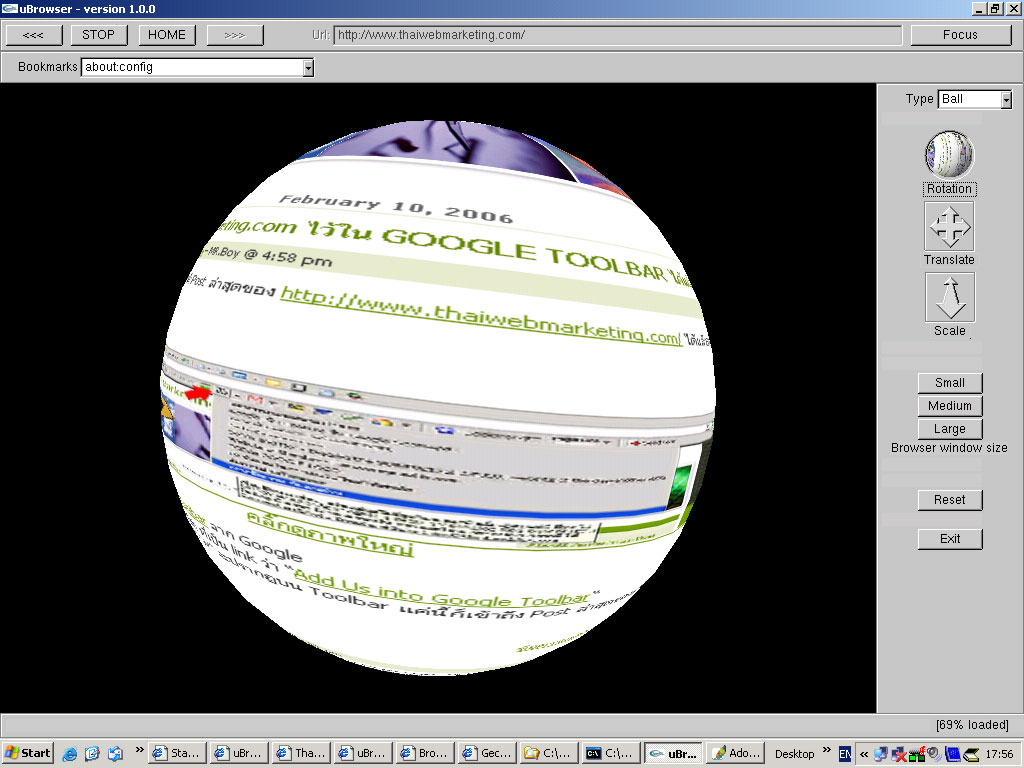 ไปเจอบราวเซอร์ประหลาด ที่ทำให้เราเห็นเว็บไซต์ในแบบ 3 มิติในหลายแบบชื่อ uBrowser สามารถเลือกดูเว็บไซต์ในรูปแบบมัน ๆ จี๊ดกว่าเดิมอย่างเช่น แบบลูกบาศก์ แบบลูกโลก แบบ animationยึกยือ(ไม่รู้จะเรียกว่าอะไรดี) โดยเราเป็นคนควบคุมเอง ตอนนี้มีให้ดาวน์โหลดเฉพาะ WINDOW ที่นี่ โดยเลือกตรงที่เป็น Executable (Windows only right now) ซึ่งเป็นไฟล์ ZIP