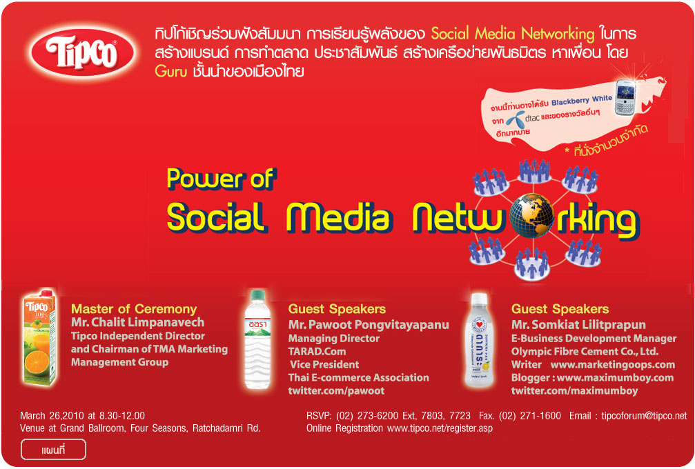 ทิปโก้ขอเชิญร่วมฟังสัมมนา Social Media Networking ในการสร้างแบรนด์ การทำการตลาด ประชาสัมพันธ์ สร้างเครือข่ายพันธมิตร หาเพื่อน โดย Guru ชั้นนำของเมืองไทย
