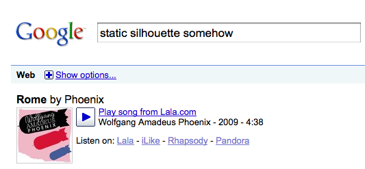 เริ่มใช้ได้แล้ว Google Music Search ฟีเจอร์ล่าสุดของ Google สำหรับคนรักเสียงเพลงสามารถค้นหาเพลง อัลบั้ม ชื่อศิลปิน จาก หน้า Search ปกติของ Google ซึ่งคุณสามารถค้นหาชื่อเพลง ศิลปิน หรืออัลบั้ม ได้โดยพิมพ์ เนื้อร้องบางส่วน ท่อนฮุค ผลค้นหาจะก็ปรากฏ ชื่อเพลง ชื่อศิลปิน พร้อมทั้งปุ่ม play ที่ให้คุณทดลองฟังกันได้ทันที รวมทั้งลิงก์ที่จะไปสู่การซื้อเพลงนั้นๆ อีกด้วย