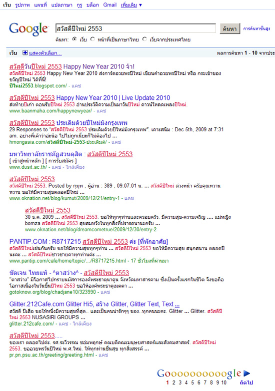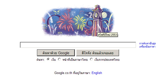 02Jan 2010 Google สวัสดีปีใหม่ by Maximumboy ⋅ 1 Comment ทุกครั้งที่มีเทศกาลสำคัญๆของโลก Google ก็จะปรับ Logo (google doodle)หน้าแรกให้เข้ากับเทศกาลนั้น ในปีใหม่ Search Engine ที่มีส่วนแบ่งการตลาด Search มากที่สุดทักทายเราว่า “สวัสดีปีใหม่ 2553″ พร้อมผล Search ที่ไม่ต้องคลิ๊ก “ดีใจจัง ค้นแล้วเจอเลย ” ครับ Share this:Share on TumblrEmail Related Posted in: Search Engine Marketing ⋅ Tagged: 2010, E-News, google, new year, Search Engine Marketing